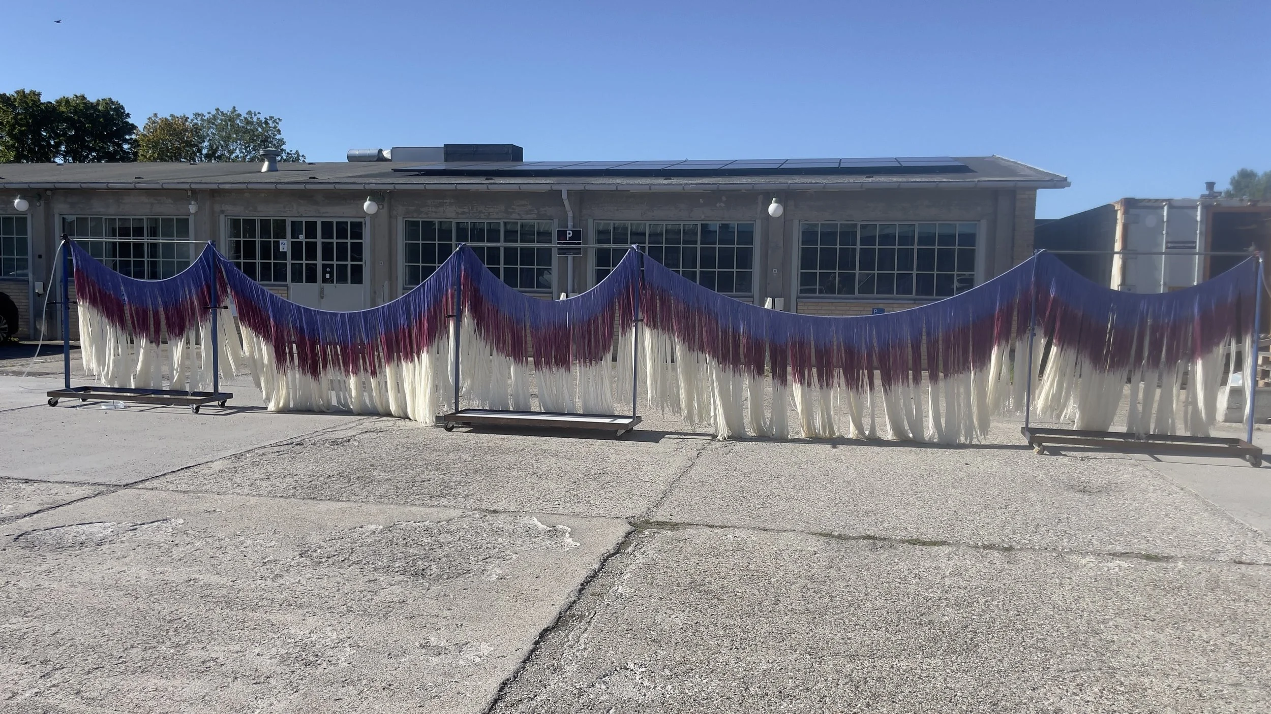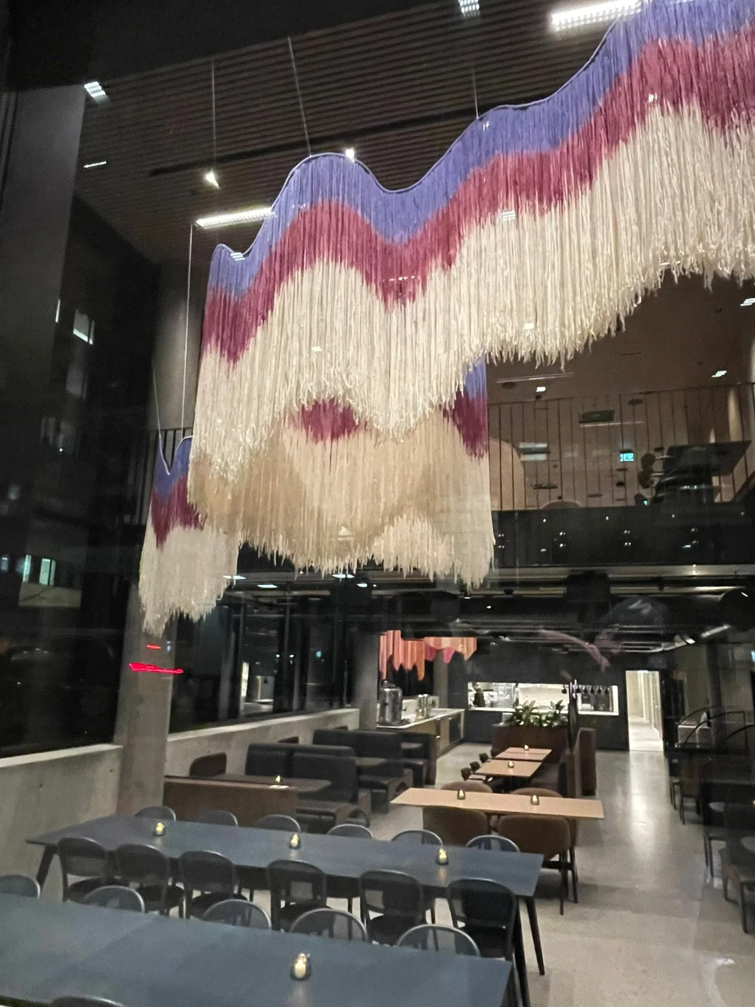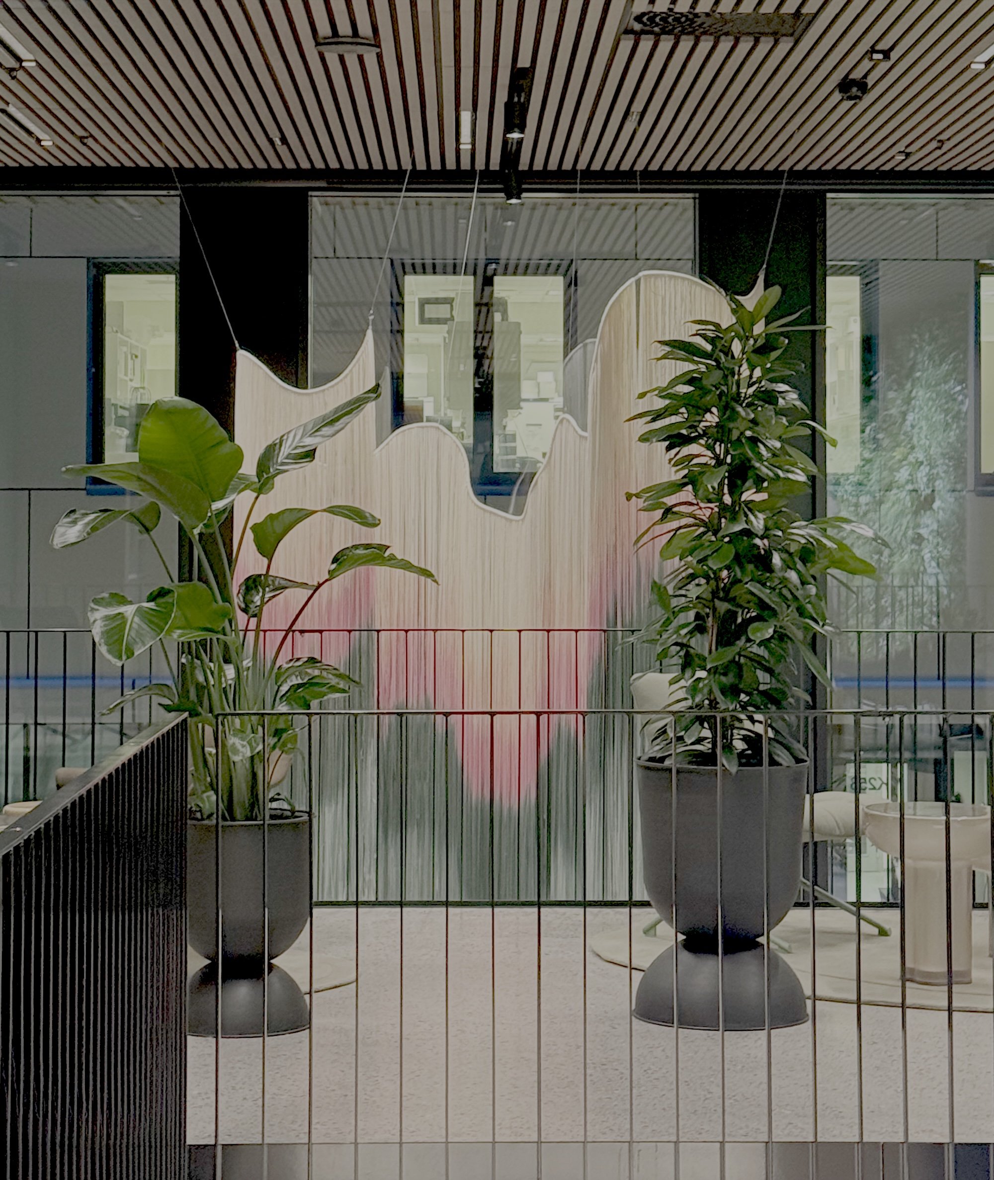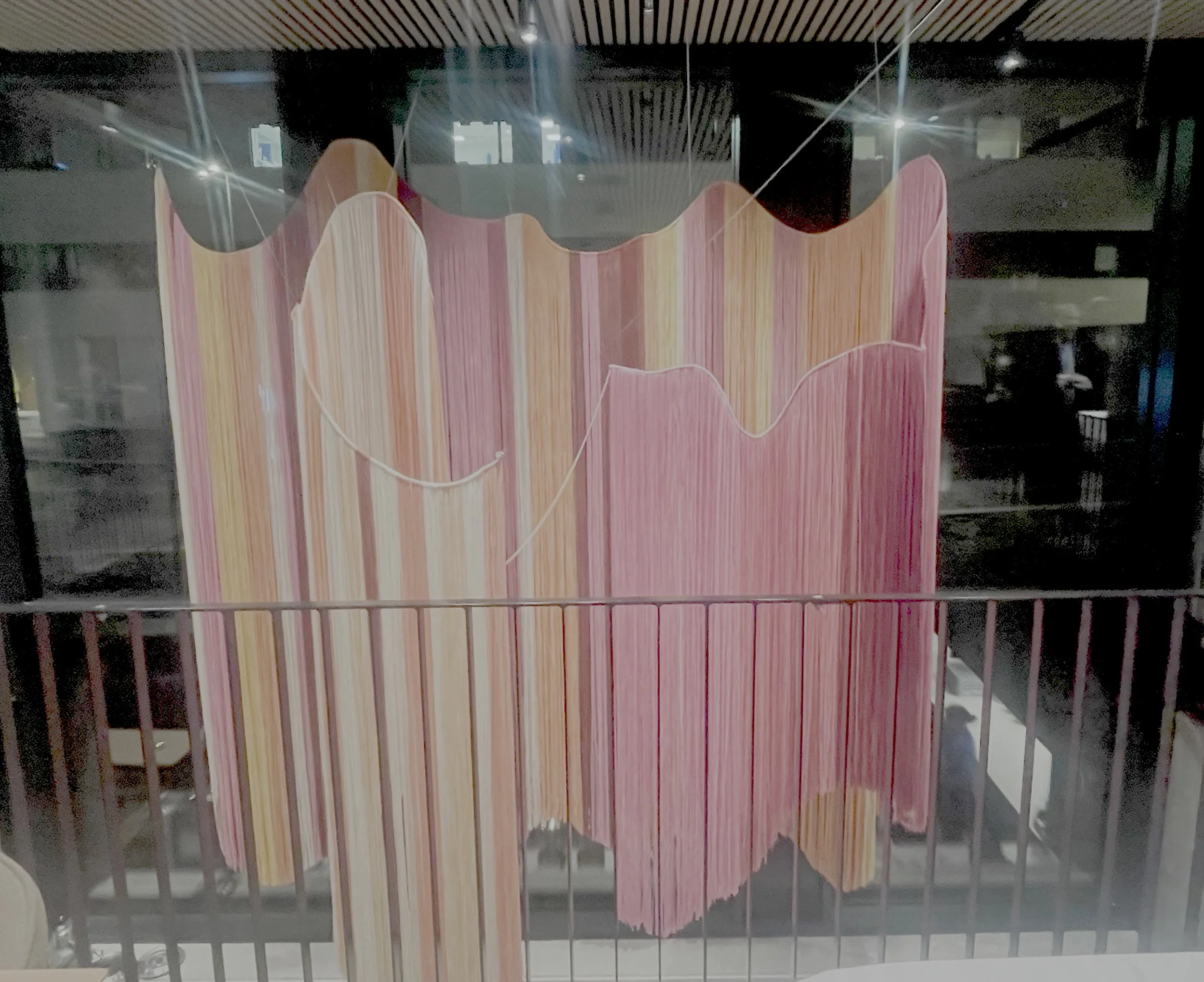 Skulpturerne skabes af tusindvis af indfarvede garntråde, formet til monumentale, lette strukturer, som forbinder bygningens etager og skaber både fysisk og visuel sammenhæng.